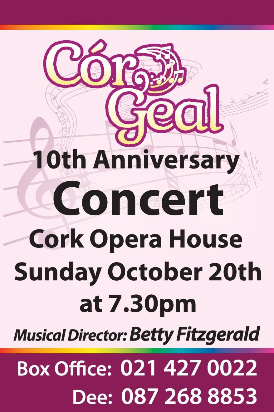 Cór Geal then commenced serious rehearsing for the 10th Anniversary Concert “Bravo” at the Cork Opera House, which was performed on the 20th October, to a “sell-out” audience. Fr Ray Kelly was a guest artist on the evening, and the event was attended by many dignitaries and was a roaring success.