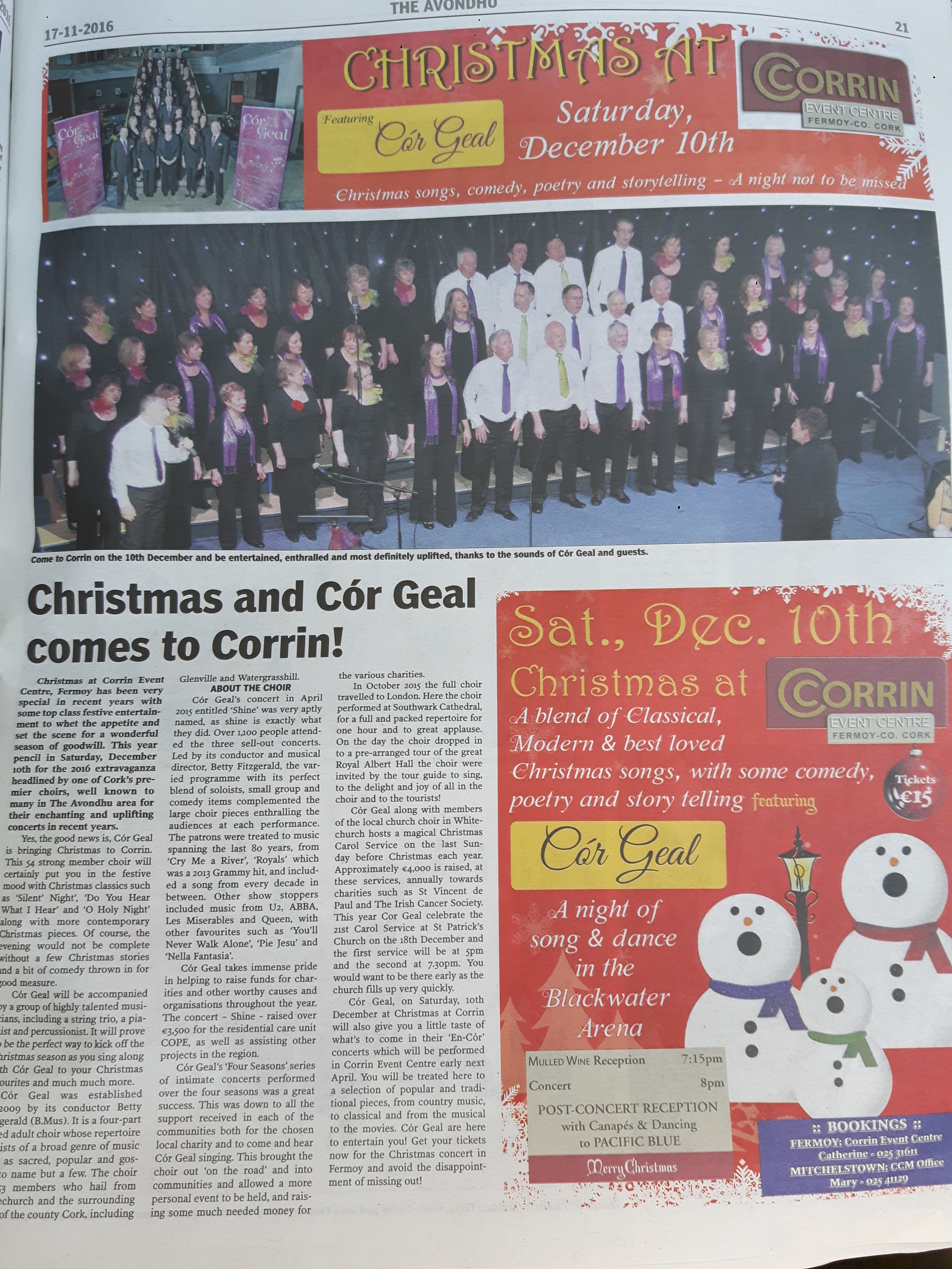 Cór Geal, in 2017 had another exciting year for with so many varied performances which began with our 3 Sold Out ‘En-Cór’ concerts in Corrin Events Centre.