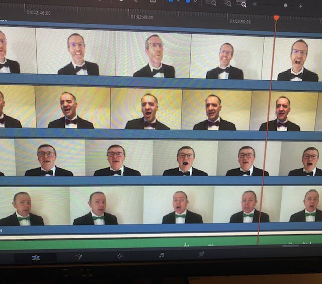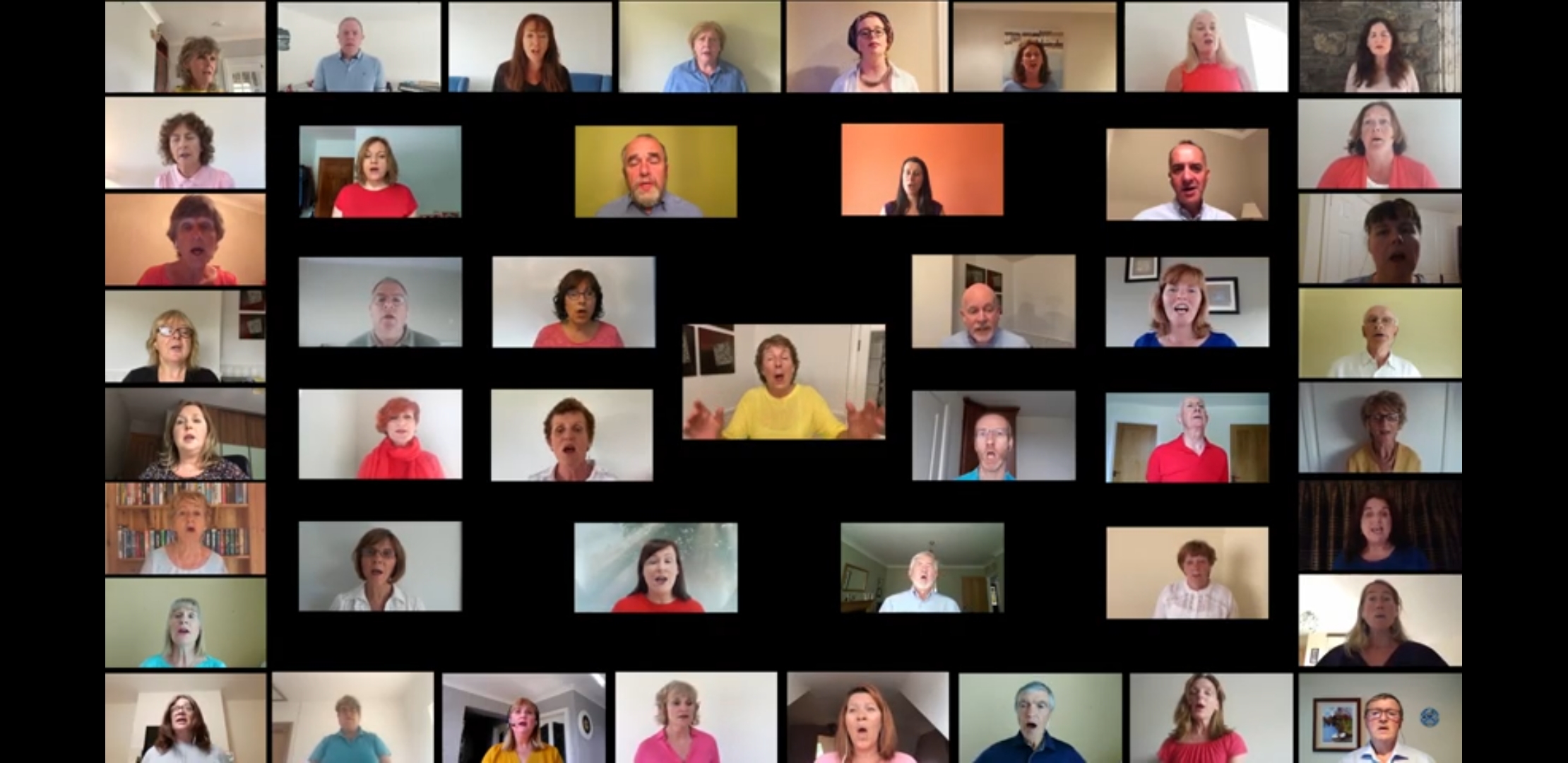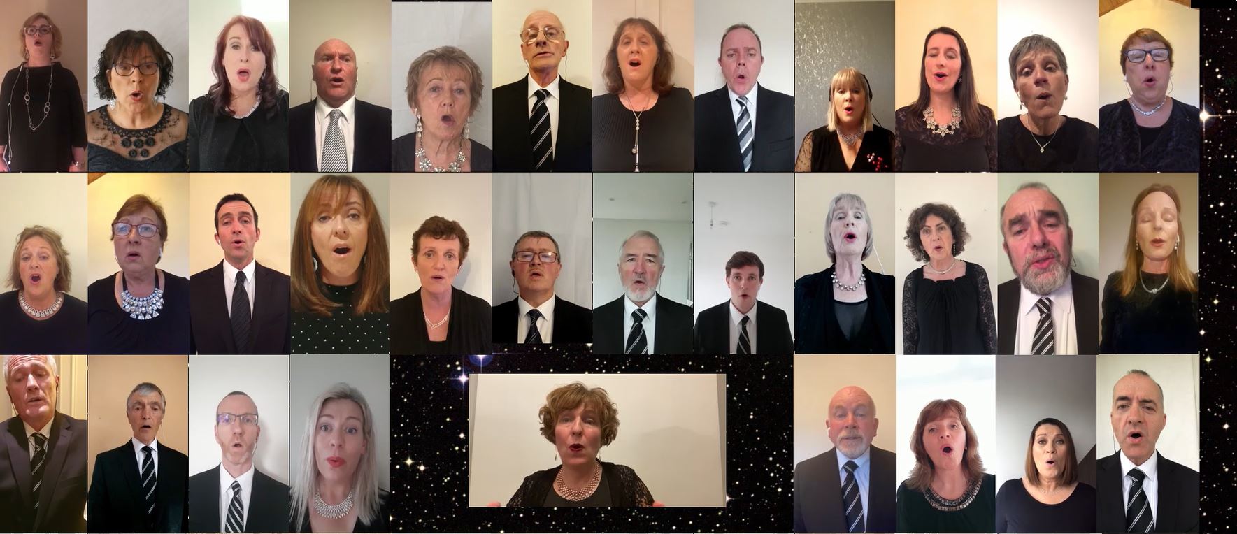 48 Cór Geal members recorded themselves at home, sent the recordings Betty Fitzgerald, our musical Director, for approval, who THEN sent them to Bríd, and then the magic, that you see here, was created.