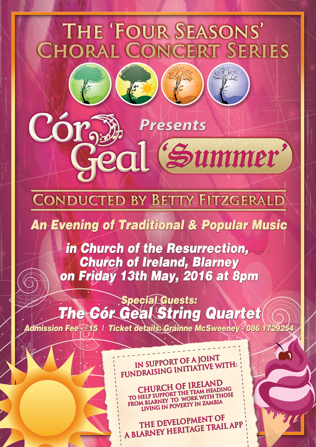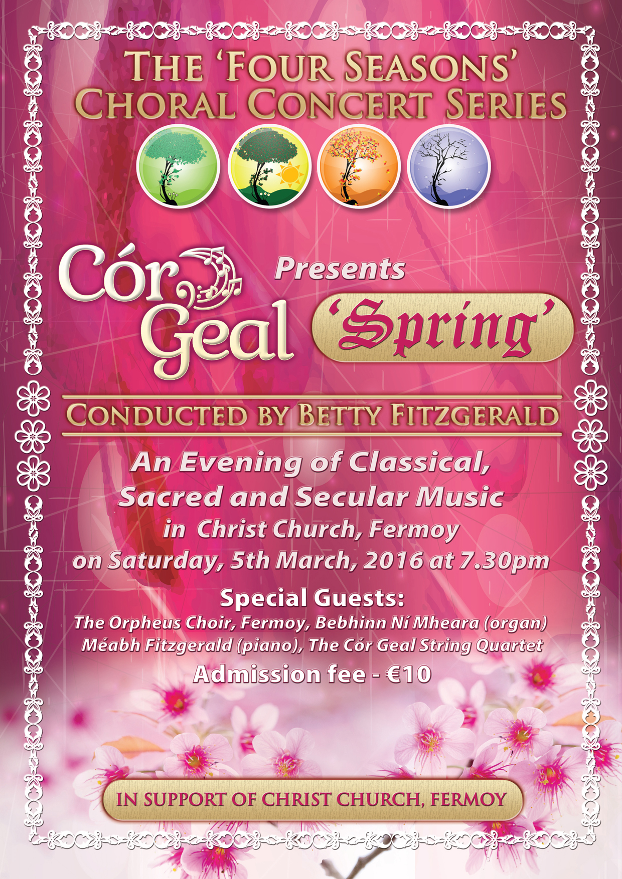 Also, Cór Geal has been invited to perform with the Carrignavar Church Choir at a fund-raising concert in the Church of the Immaculate Conception, in Carrignavar on March 15th. This promises to be a great evening where both choirs will present their own repertoire of uplifting songs, along with performing some songs together.