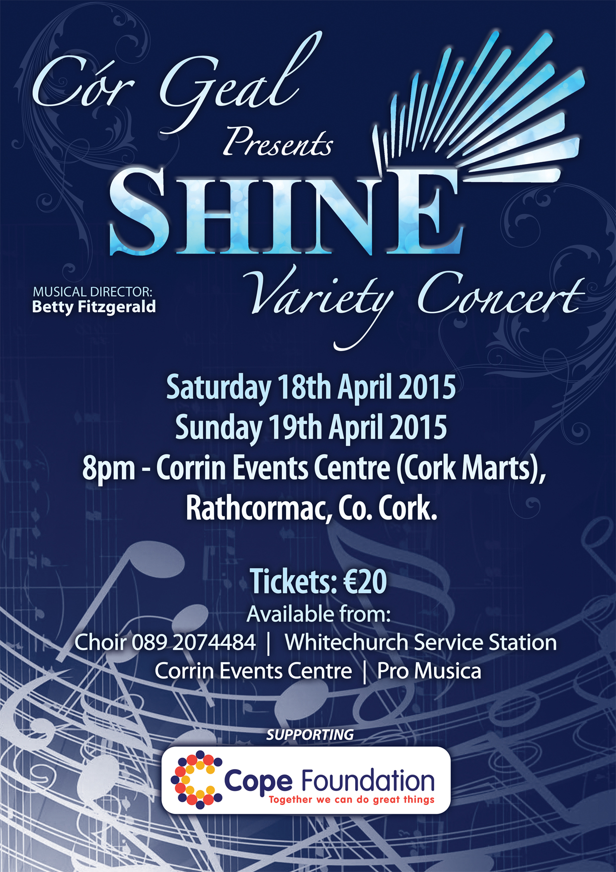 In 2011, Cór Geal staged its first full-length variety concert The Time of our Life. This concert was such a success that it paved the way for subsequent concerts, Viva La Música in 2013 and Shinein 2015, and led to the reputation that Cór Geal has for producing top class and exciting variety concerts.
