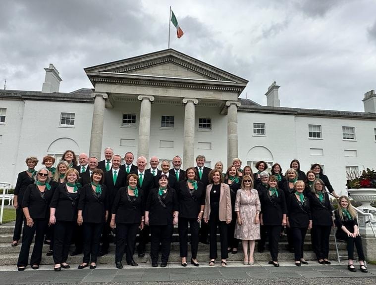 On 2nd July Cór Geal were invited to sing at Áras an Uachtaráin at a Summer Garden party hosted by President Micheál D. Higgins. Even though it was at very short notice, 32 members were available to attend. Within 48 hours, Betty quickly organised a suitable song programme and a choir rehearsal and Grainne McSweeney organised the trip. We were ready and raring to go!